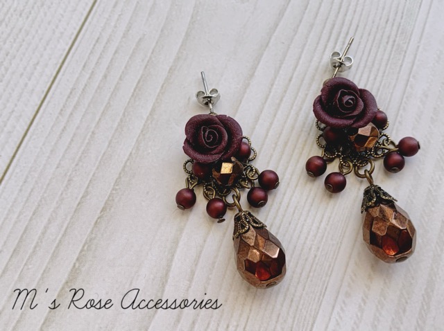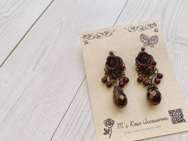 ダークブラウン薔薇ブーケの可憐なピアスです。