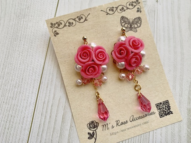 ストロベリーピンク薔薇ブーケの華やかなピアスです。