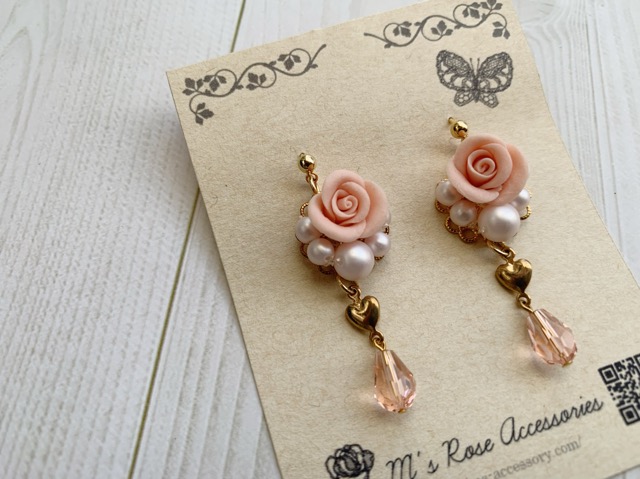 レース編みの花のようなアンティーク調の透かしパーツに、M’sオリジナルクレイ薔薇のサーモンピンクをパールとともに飾りました。