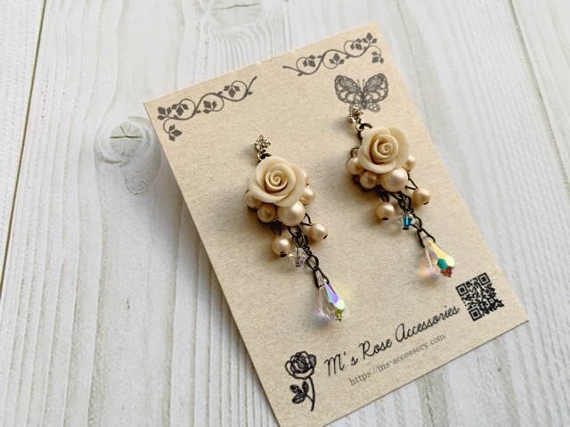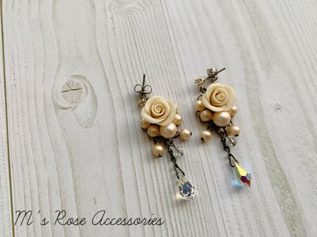 レース編みの花のようなアンティーク調の透かしパーツに、M’sオリジナルクレイ薔薇のシャンパンをパールとともに飾りました。