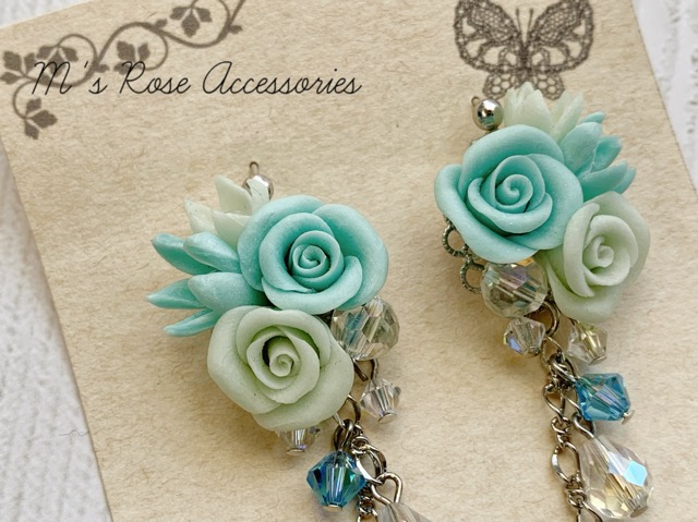 レース編みの花のようなアンティーク調の透かしパーツに、M’sオリジナルクレイ薔薇のスカイブルーをパールとともに飾りました。