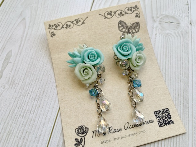 スカイブルー薔薇ブーケの可憐なピアスです。