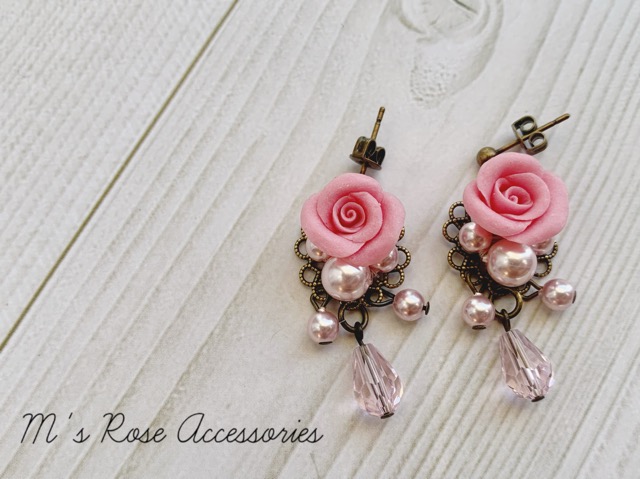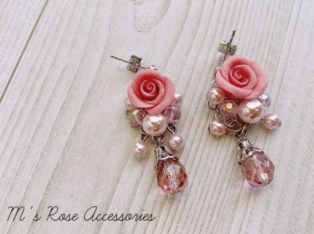 ストロベリーピンク薔薇のピアス(レディメイド)