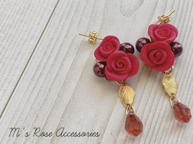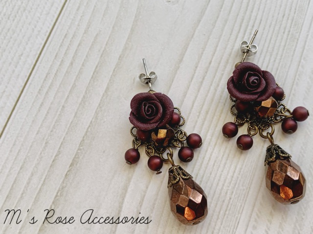 ワインレッド薔薇とチェコガラスのピアス(イヤリング)(レディメイド)