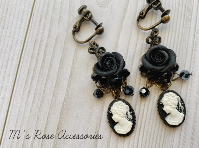 ダークパープル薔薇とリーフのピアス(イヤリング)(レディメイド)